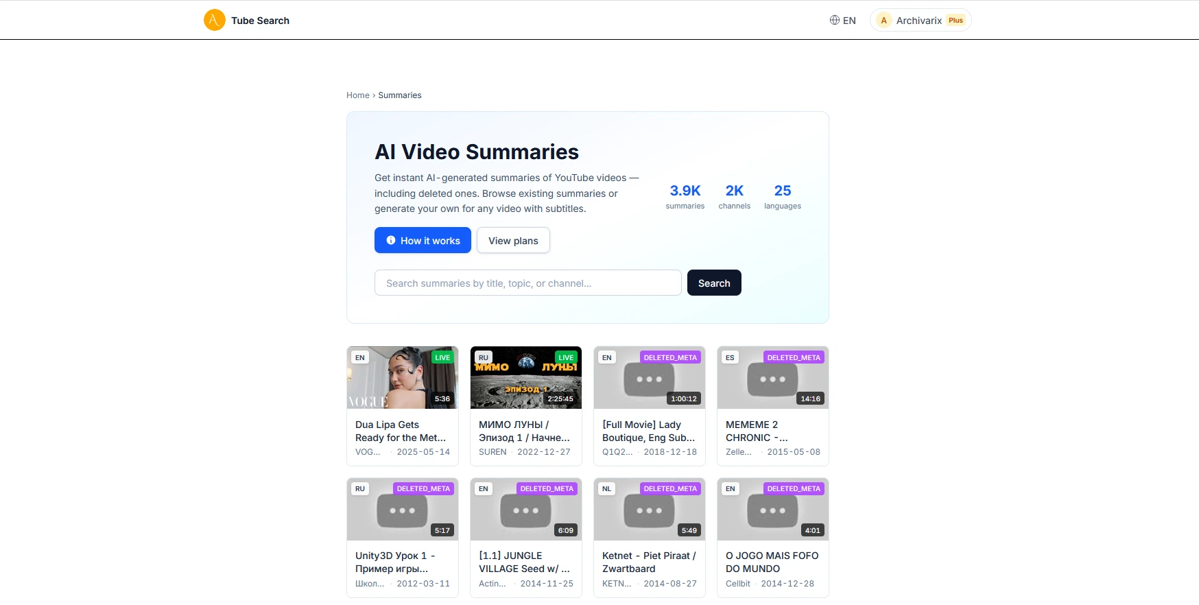 We have added AI-powered video summaries to Tube Search. If a video has archived subtitles, the system can now generate a structured summary of its content in seconds.