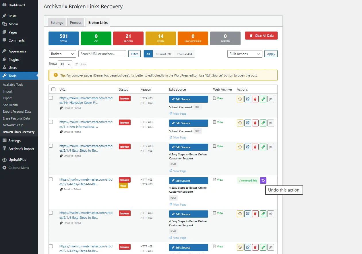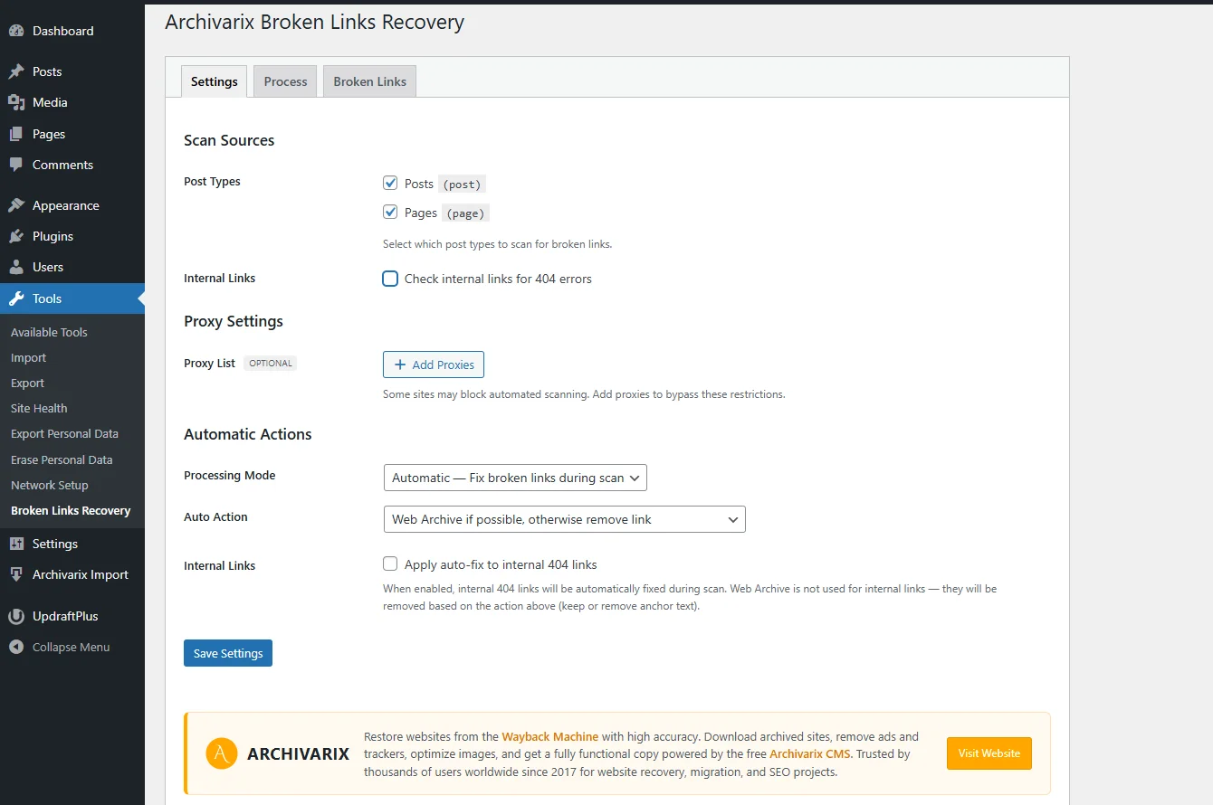 Over time, external links in WordPress posts inevitably break, pages get deleted, domains expire, videos become unavailable. Checking hundreds or thousands of links manually is impractical. Archivarix…